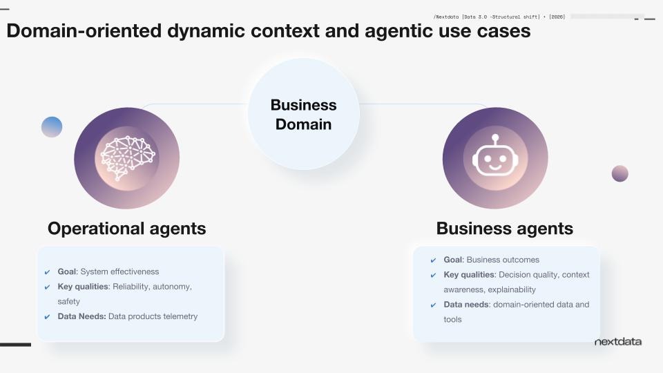 Together, the business and operational context of a domain guide agents to plan and execute their goals. Business agents focus on outcomes like improving customer satisfaction, while operational agents improve effectiveness safely and reliably.